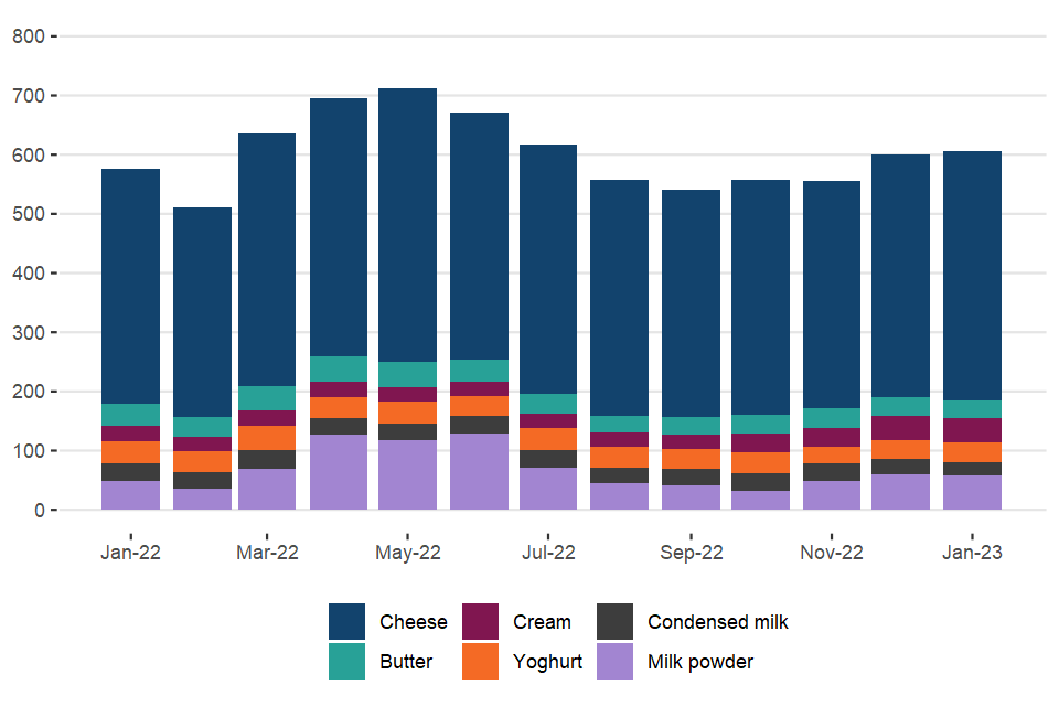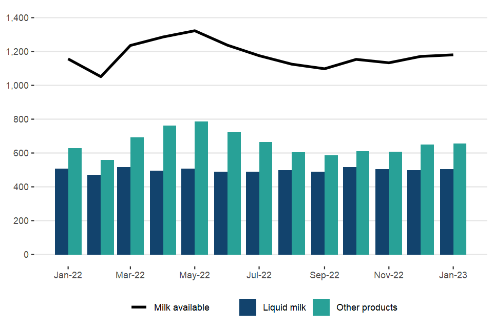 Usage of milk by dairies in the United Kingdom statistics: January 2023 (published 02 March 2023)