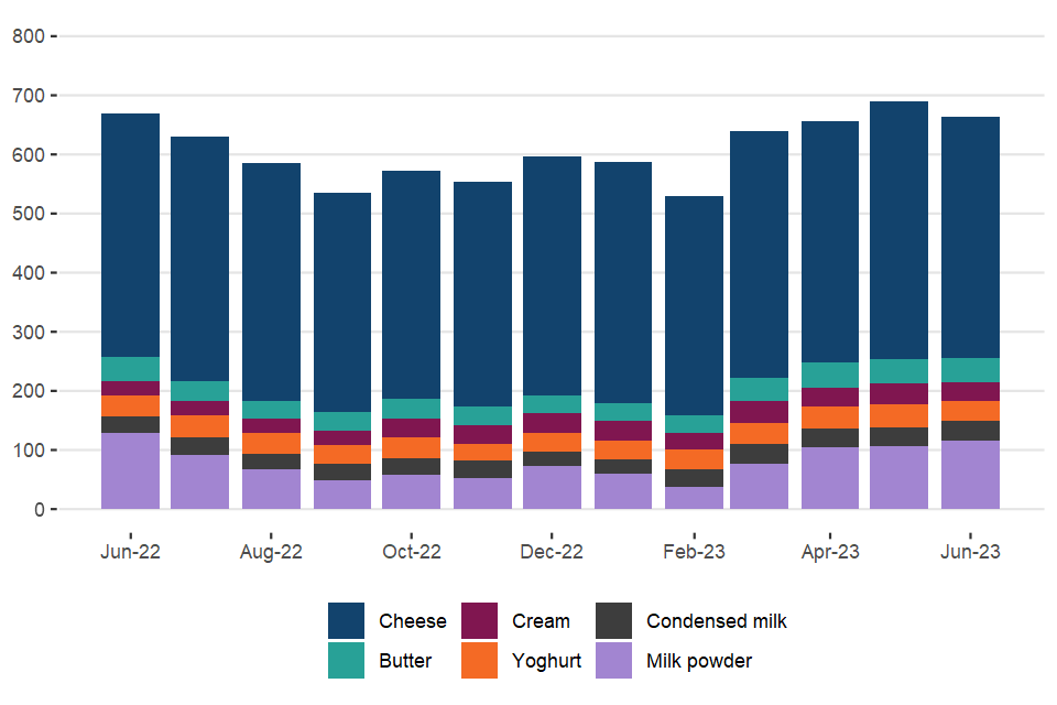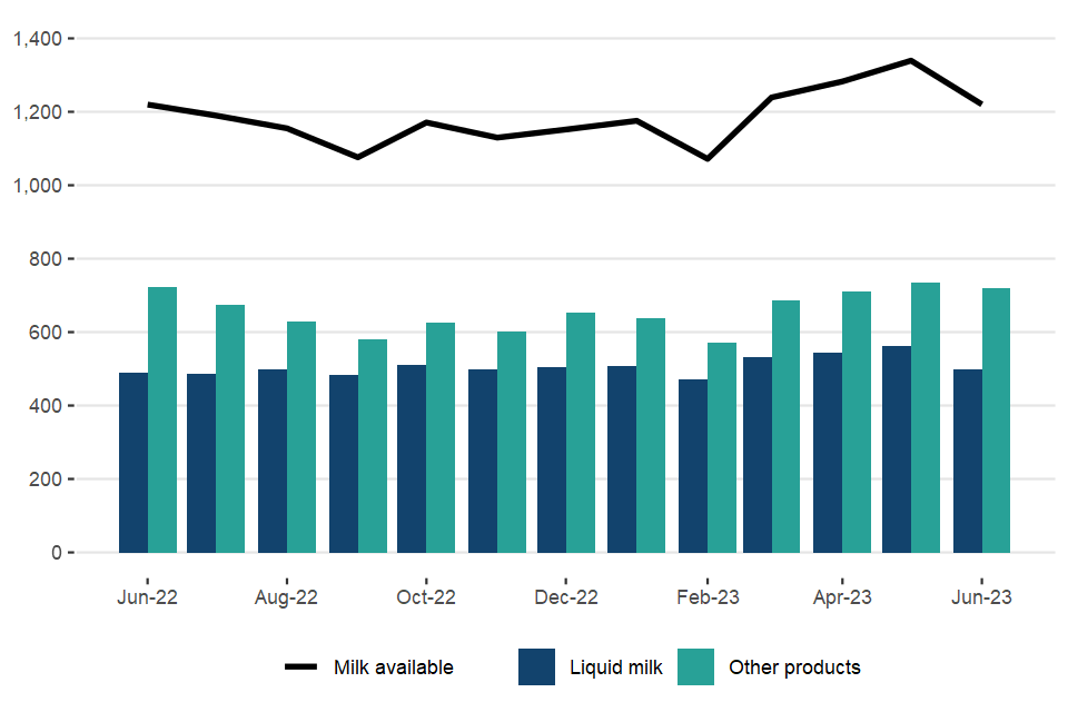 Usage of milk by dairies in the United Kingdom statistics: June 2023 (published 03 August 2023)