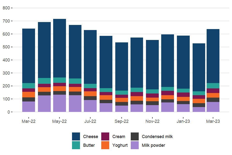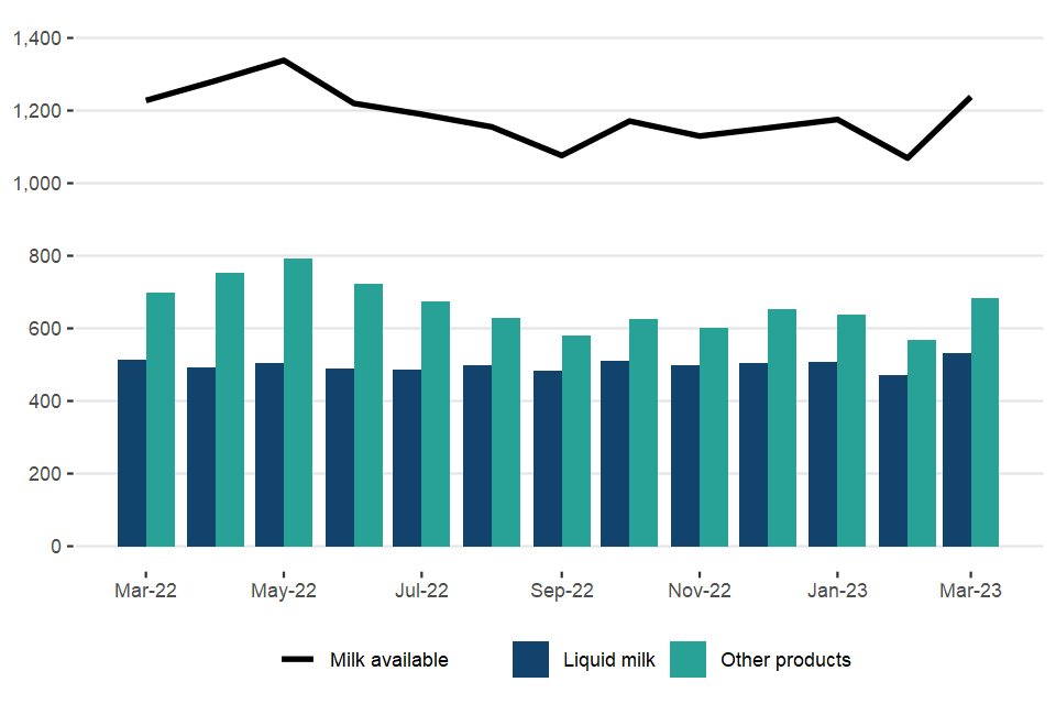 Usage of milk by dairies in the United Kingdom statistics: March 2023 (published 04 May 2023)