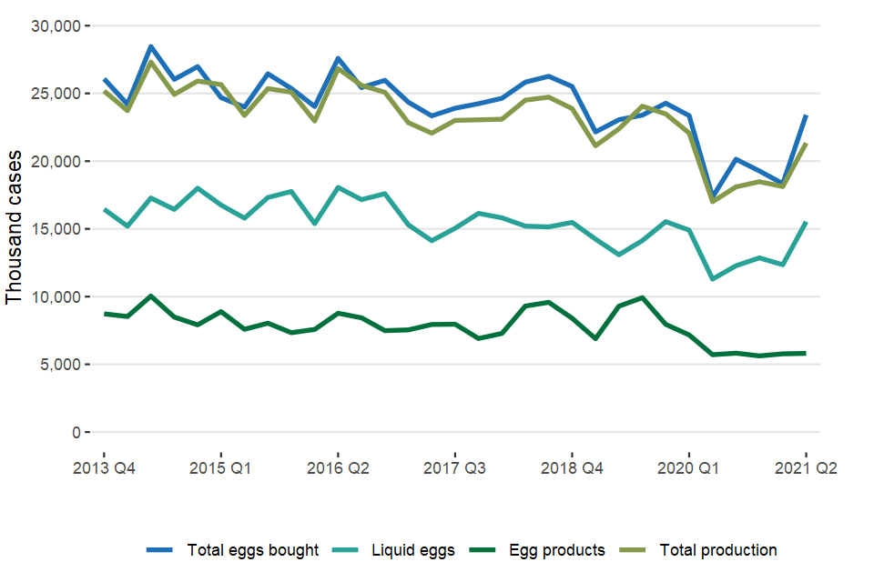 - The production of egg products during the second quarter of 2021 totalled 21.3 thousand tonnes, a 18% increase on the previous quarter and a 16% increase on the second quarter 2020.