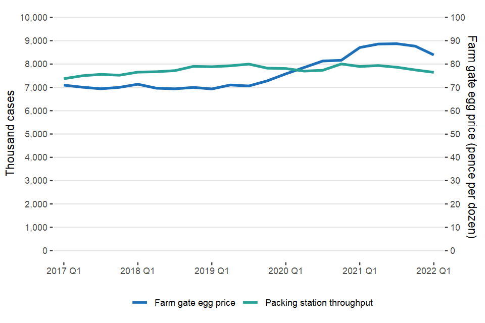 - 7.6 million cases of eggs were packed in UK egg packing stations during the first quarter of 2022. This represents 3.2% decrease on the first quarter in 2021 and a 1.3% decrease on quarter four 2021.