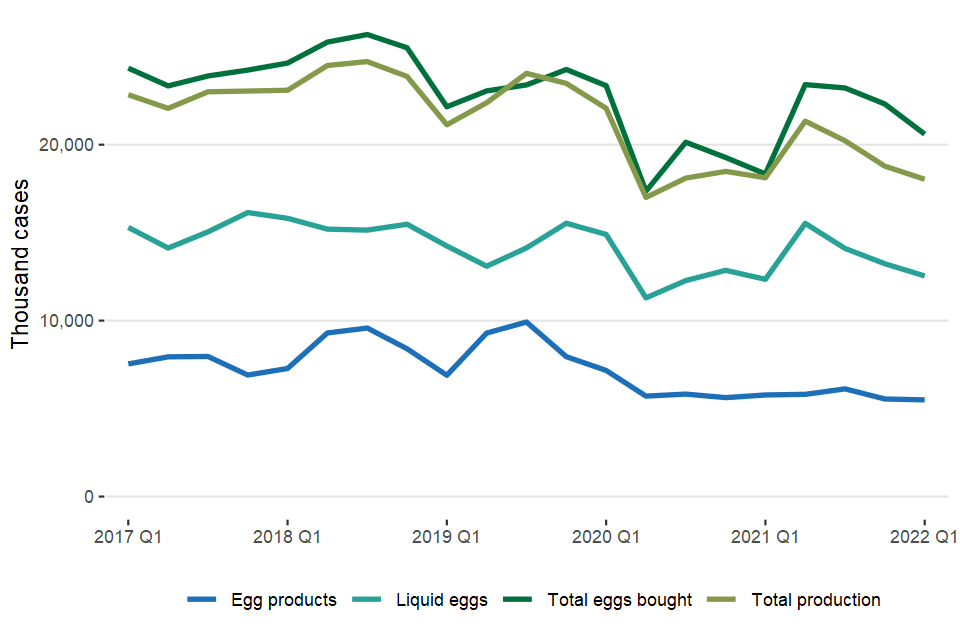 - The production of egg products during the first quarter of 2022 totalled 18.0 thousand tonnes, a 4.0% decrease on the previous quarter and a 0.5% decrease on the first quarter 2021.