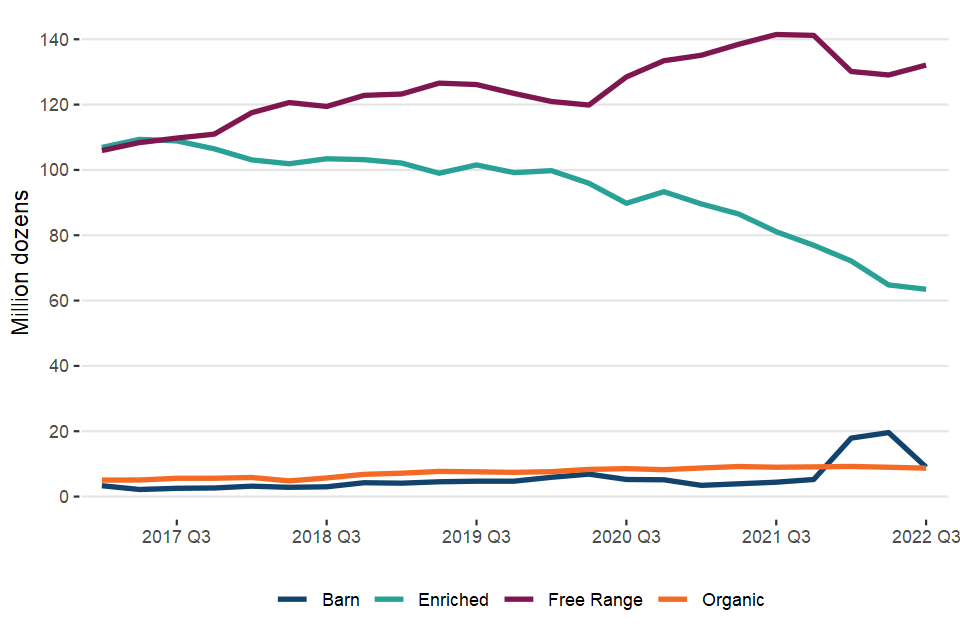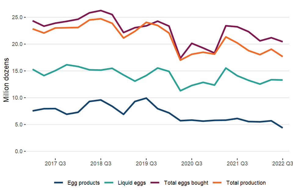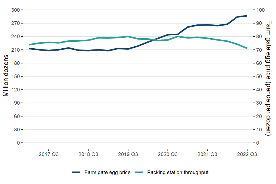 - 213 million dozens were packed in UK egg packing stations during the third quarter of 2022. This represents 9.6% decrease on the third quarter in 2021 and a 4.1% decrease on quarter two 2022.