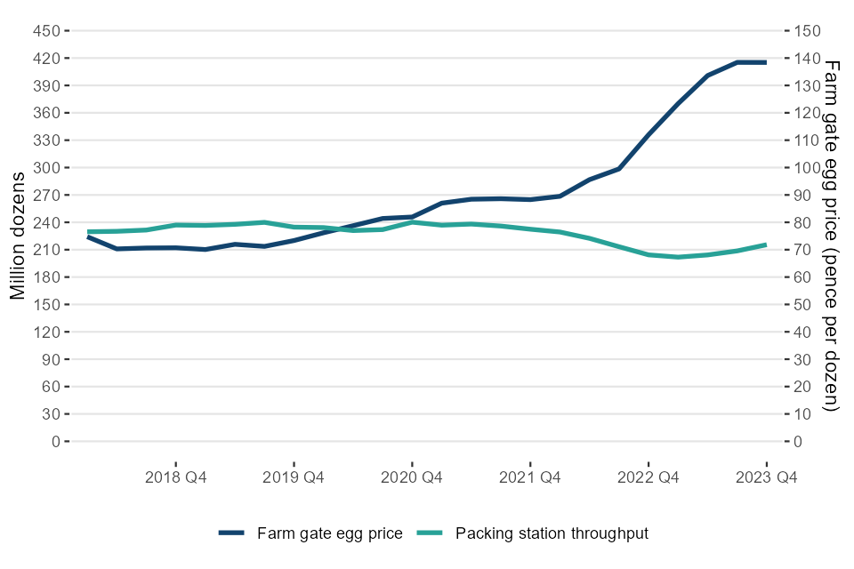 - The average UK farm-gate egg price through the fourth quarter of 2023 was 138.4 pence per dozen, this represents a 24% increase on quarter four of 2022 and a 0.1% decrease on quarter three 2023.