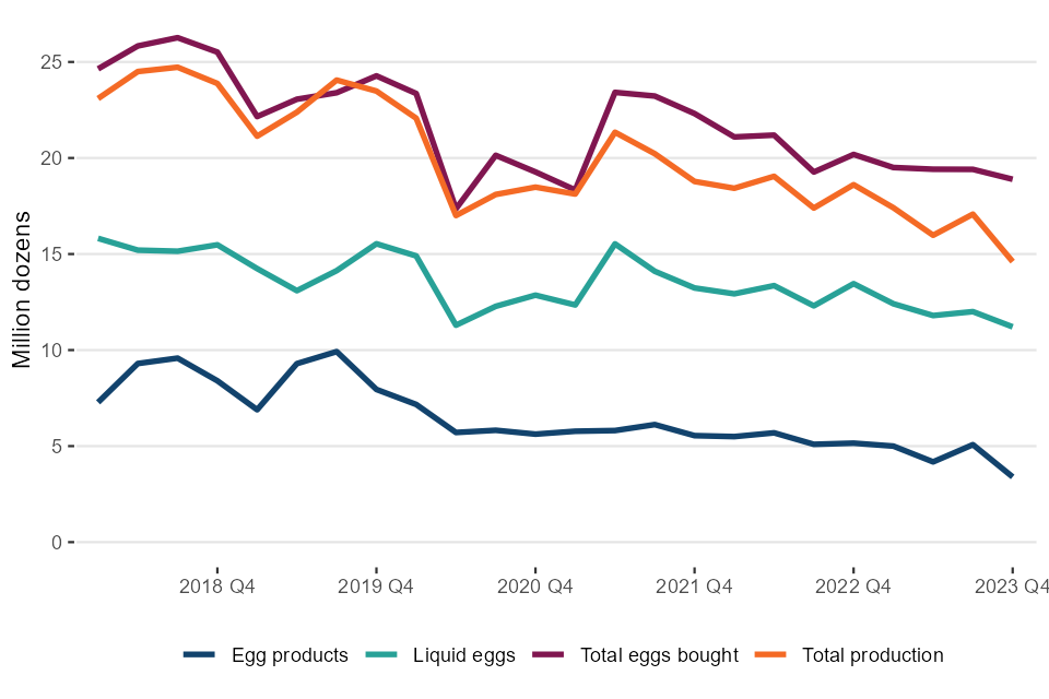 Egg processing statistics: Defra runs a quarterly survey of all registered egg processors. It is a voluntary survey of 11 respondents that collects information on the number of eggs bought by egg processors and the quantity of egg products produced. The response rate is typically 100 per cent.