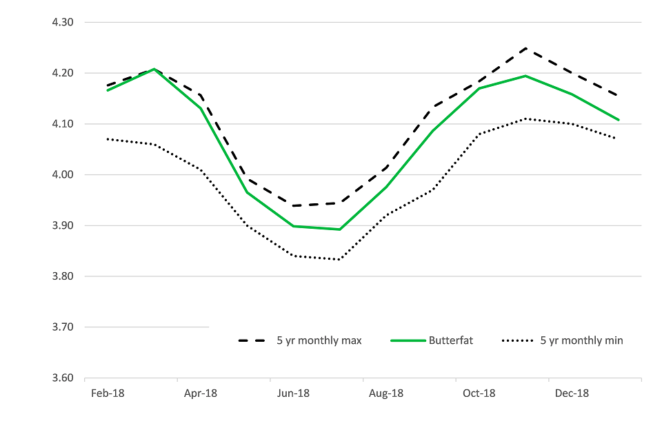 Butterfat is down 1.2% on last month at 4.11%. Compared to last year butterfat is 1.1% lower than January 2018. (Figures 1.3a).
