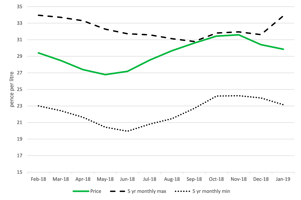 The UK average farm-gate milk price for January is 29.86 pence per litre (ppl). This represents a 1.8% (0.55 ppl) decrease on December 2018 and a 1.7% decrease on the same month last year. (Figure 1.2).