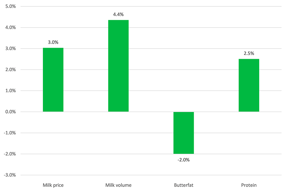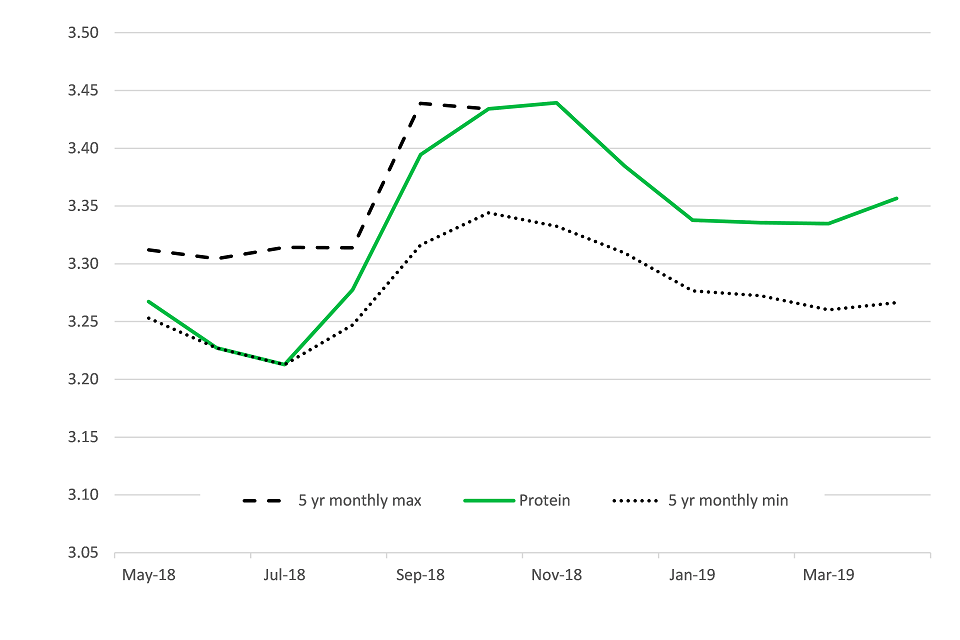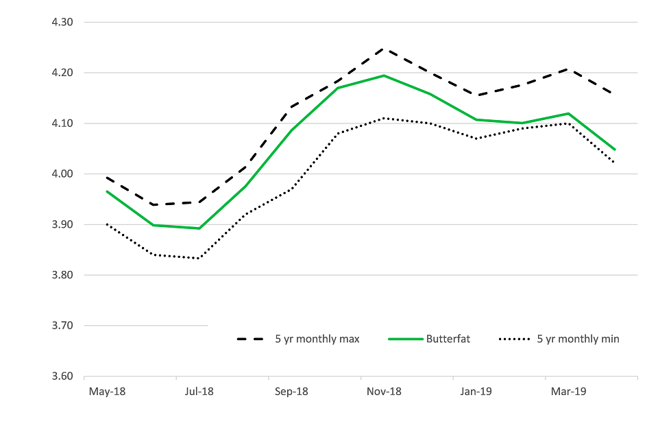 Butterfat is down 1.7% on last month at 4.05%. Compared to last year butterfat is 2.0% lower than April 2018. (Figures 1.3a).
