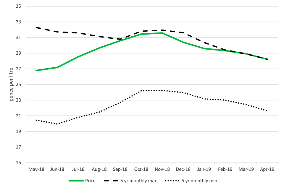 The UK average farm-gate milk price for April is 28.23 pence per litre (ppl). This represents a 2.4% (0.69 ppl) decrease on March 2019 and a 3.0% increase on the same month last year. (Figure 1.2).