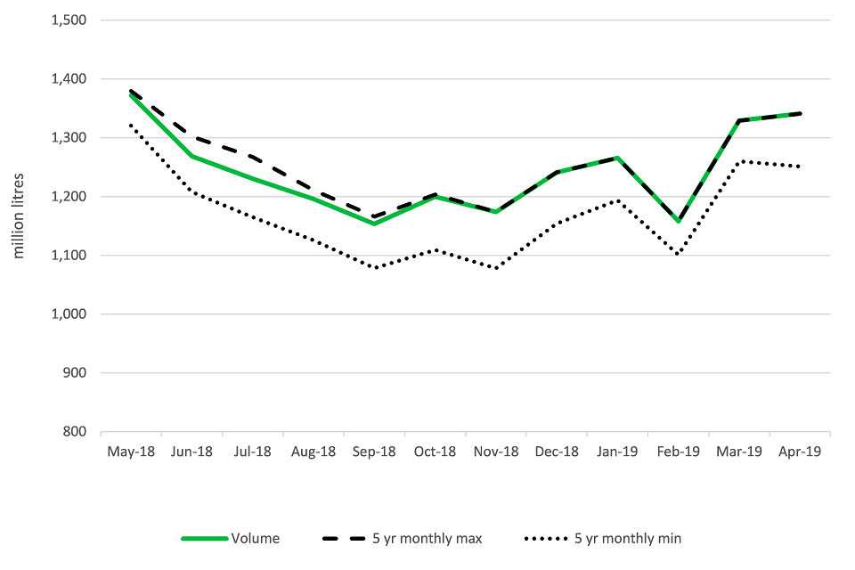 April volumes are 1,341 million litres up 4.4% on April 2018. (Figure 1.4).