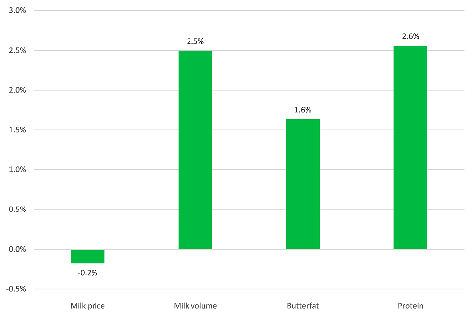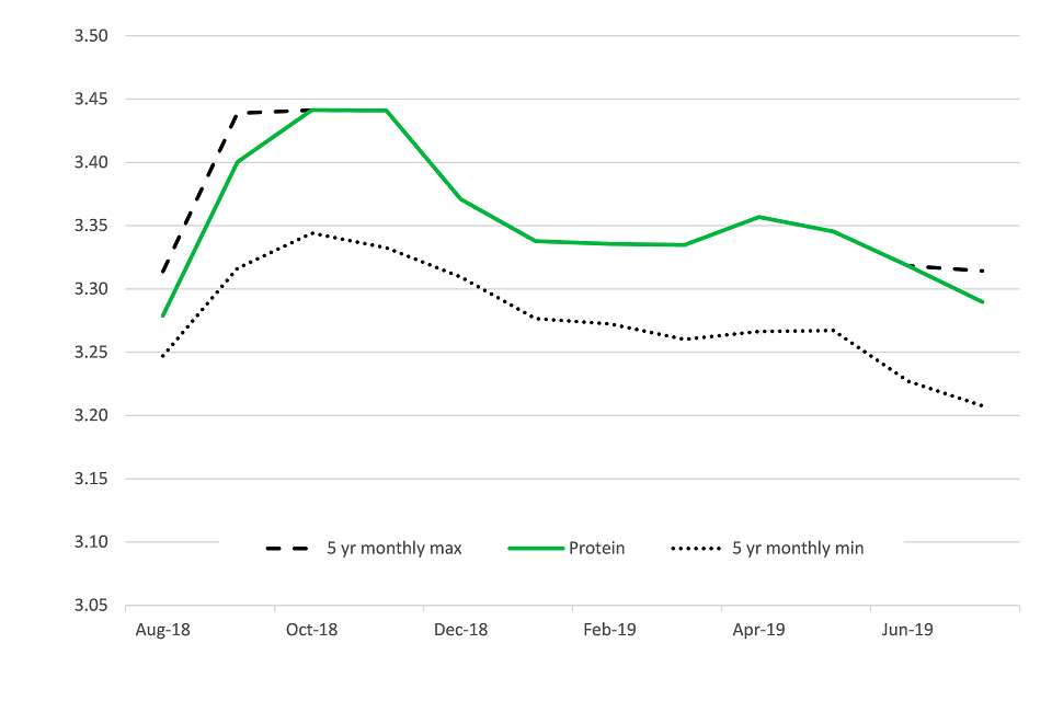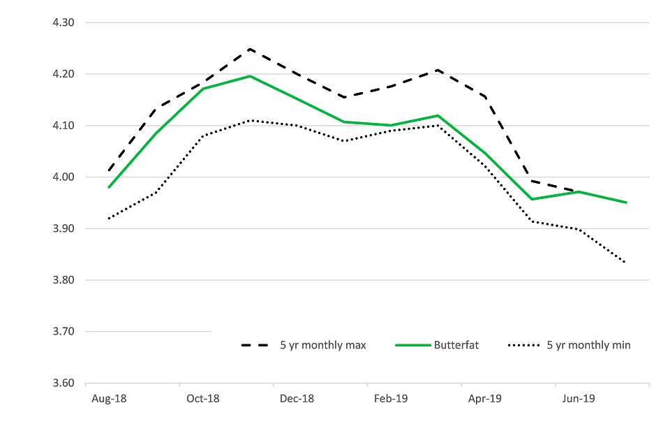 Butterfat is down 0.5% on last month at 3.95%. Compared to last year butterfat is 1.6% higher than July 2018. (Figures 1.3a).
