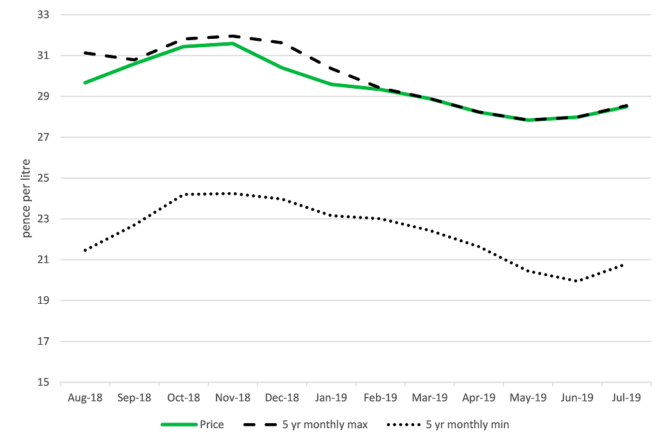United Kingdom farm-gate milk price (pence per litre) to July 2019