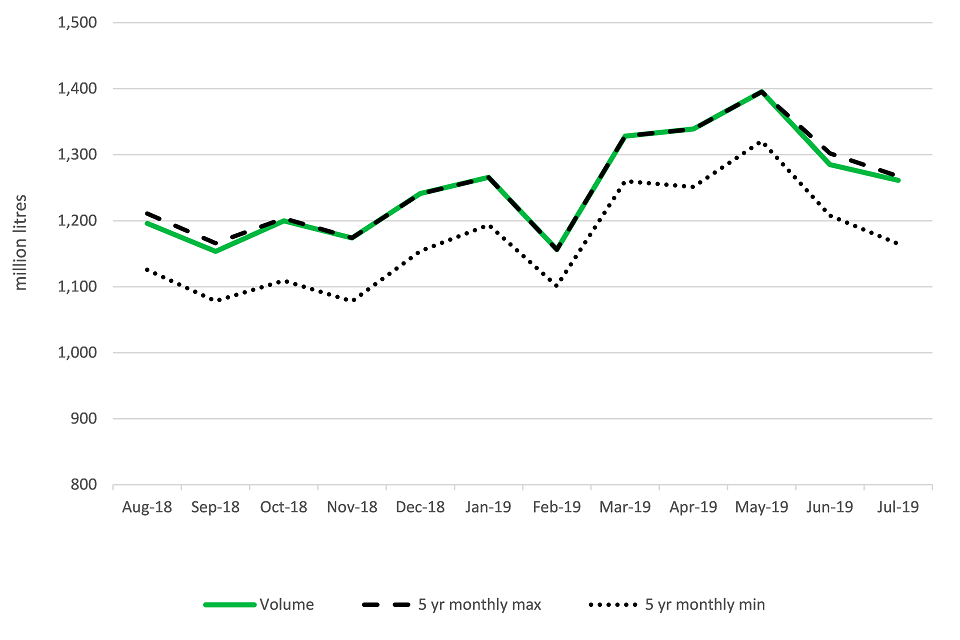 July volumes are 1,261 million litres down 1.9% on June 2019 and 2.5% higher than July 2018. (Figure 1.4).