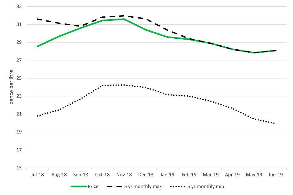 The UK average farm-gate milk price for June is 28.09 pence per litre (ppl). This represents a 0.9% (0.25 ppl) increase on May 2019 and a 3.3% increase on the same month last year. (Figure 1.2).