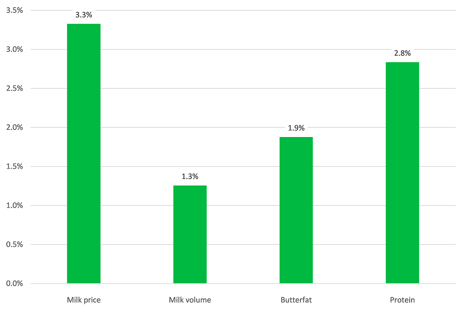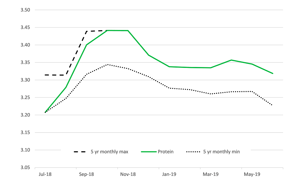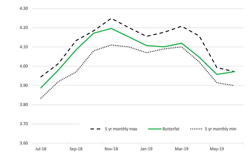 Butterfat is up 0.4% on last month at 3.97%. Compared to last year butterfat is 1.9% higher than June 2018. (Figures 1.3a).