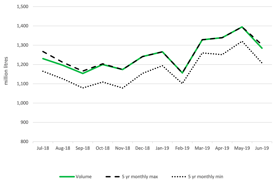 June volumes are 1,285 million litres down 7.9% on May 2019 and 1.3% higher than June 2018. (Figure 1.4).