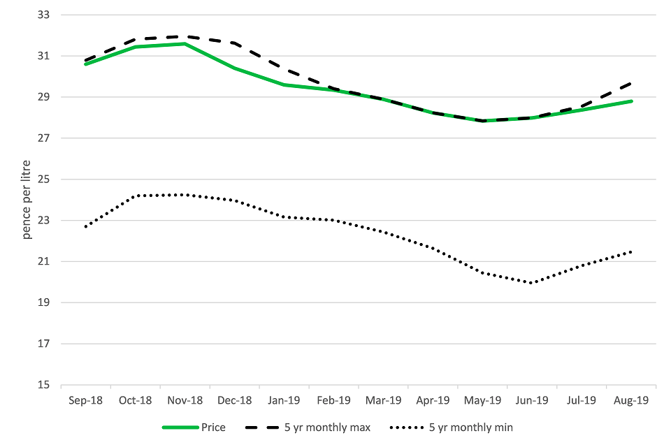 United Kingdom farm-gate milk price (pence per litre) to August 2019