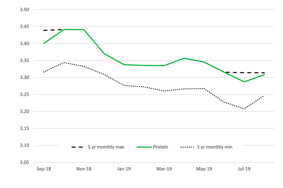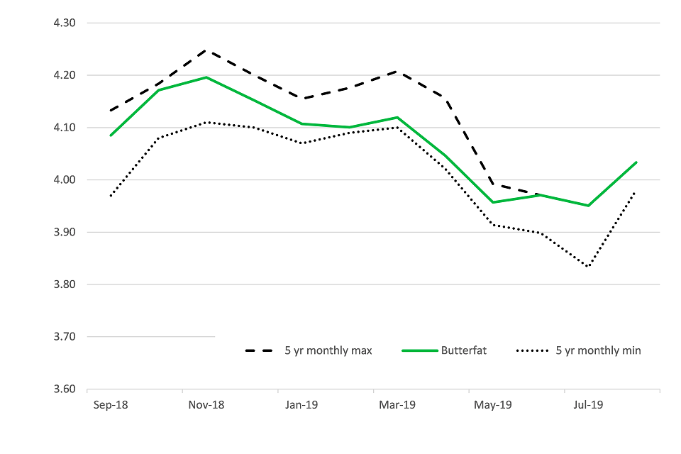 Butterfat is up 2.1% on last month at 4.03%. Compared to last year butterfat is 1.3% higher than August 2018. (Figures 1.3a).