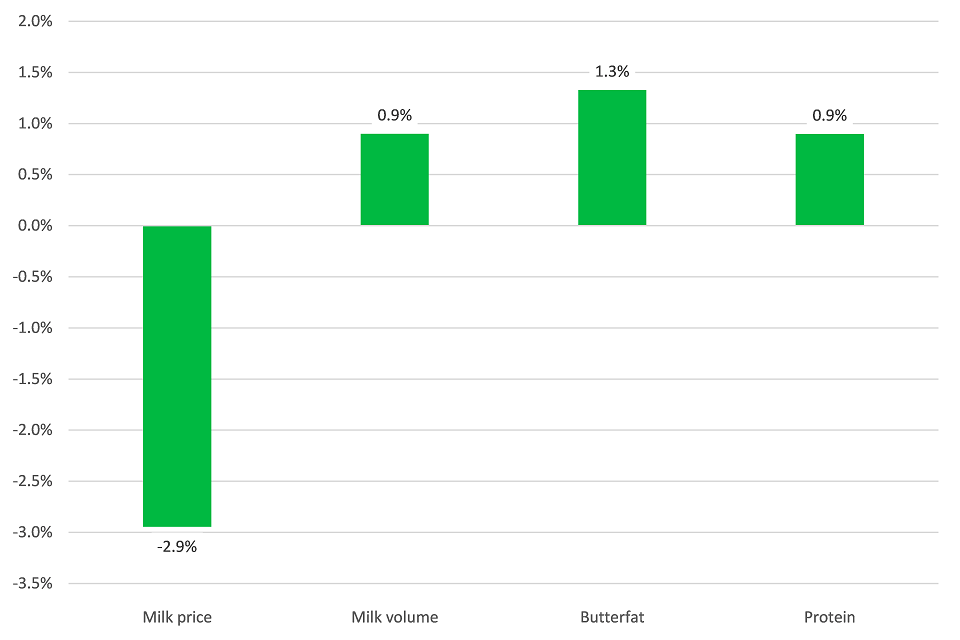 Figures 1.2 to 1.4 above show the values for the latest 12 months along with the maximum and minimum monthly values. Trends can be seen, notably the spring flush in milk production as the dairy herd diet changes when they are put out to grass in the summer. There is a strong positive correlation between milk composition (butterfat and protein content) and milk price.