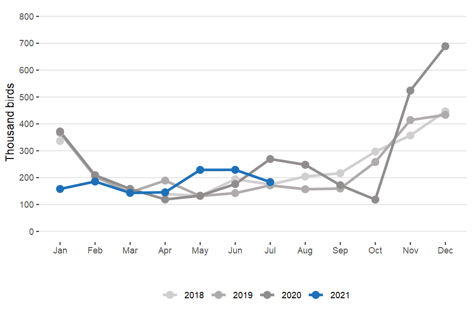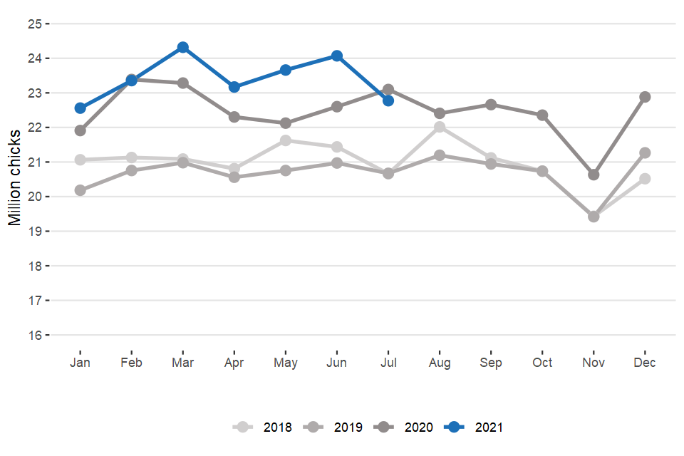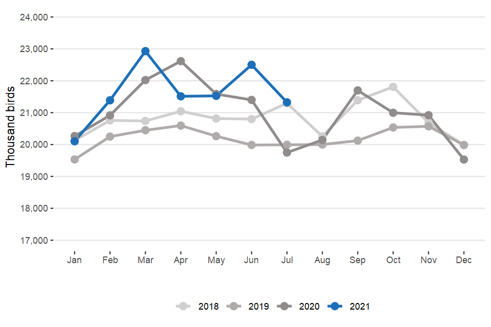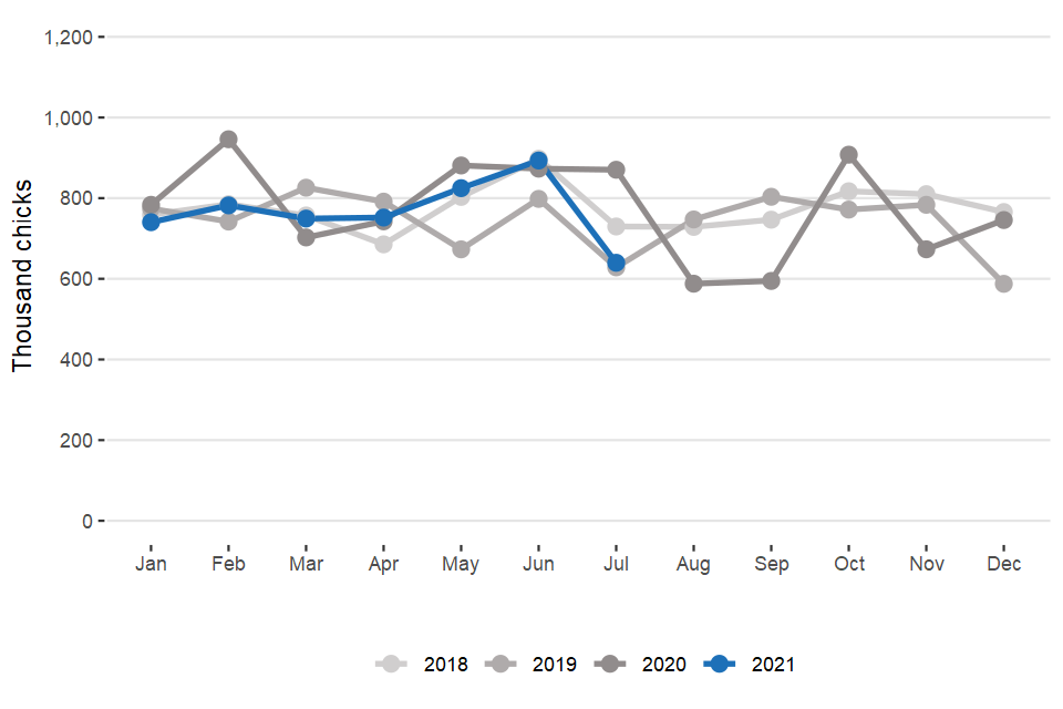 Northern Ireland slaughter data from May 2021 is estimated. Northern Ireland hatcheries data for July 2021 is estimated.