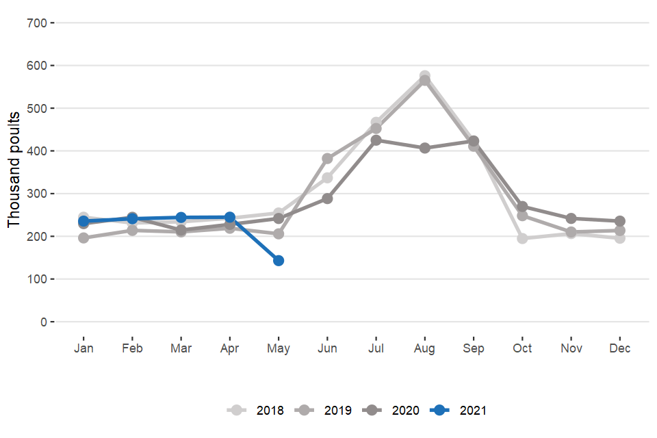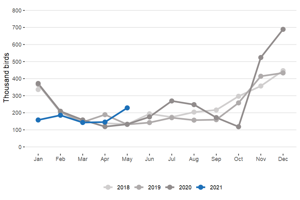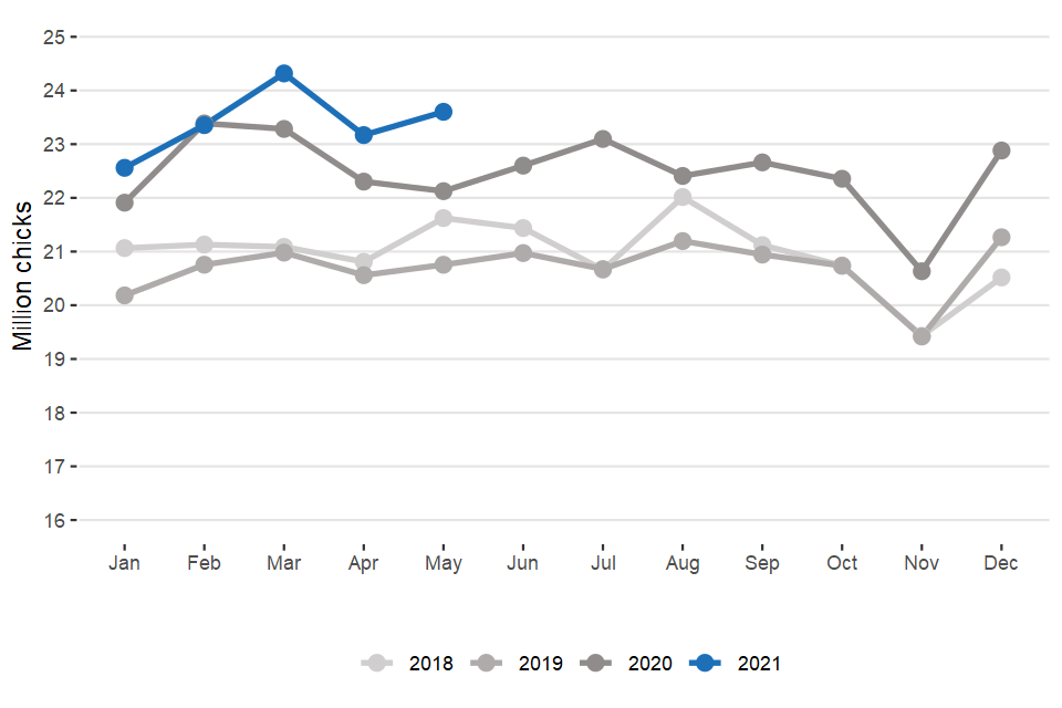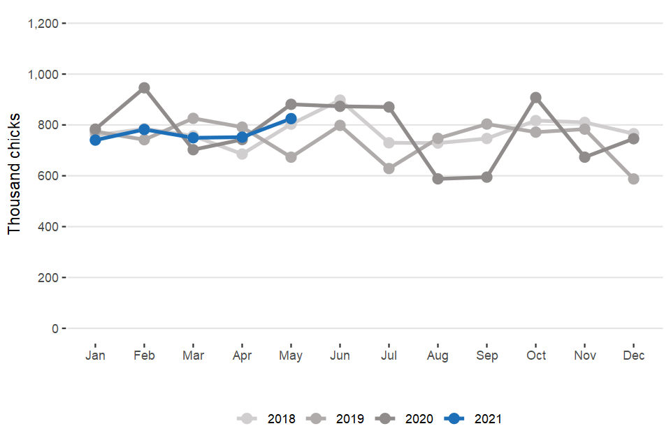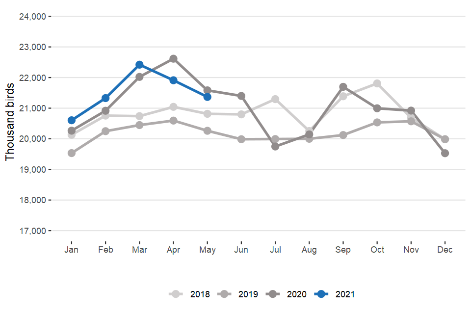 Northern Ireland slaughter data from December 2020 is estimated. Scotland hatcheries and slaughter data for May 2021 is estimated.
