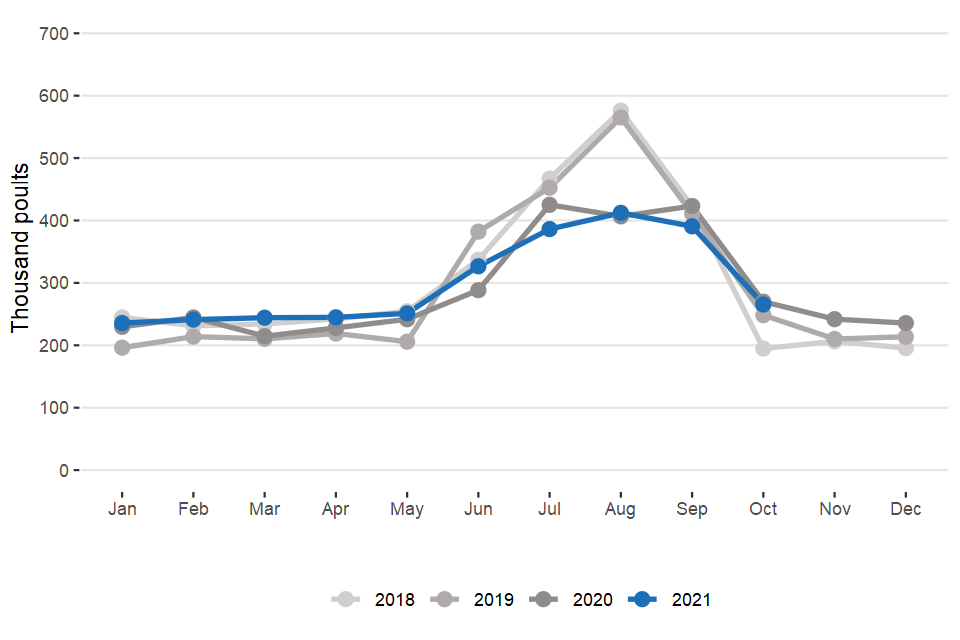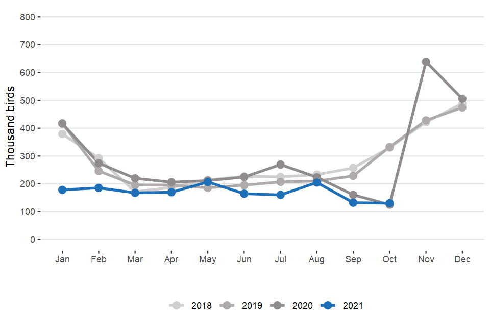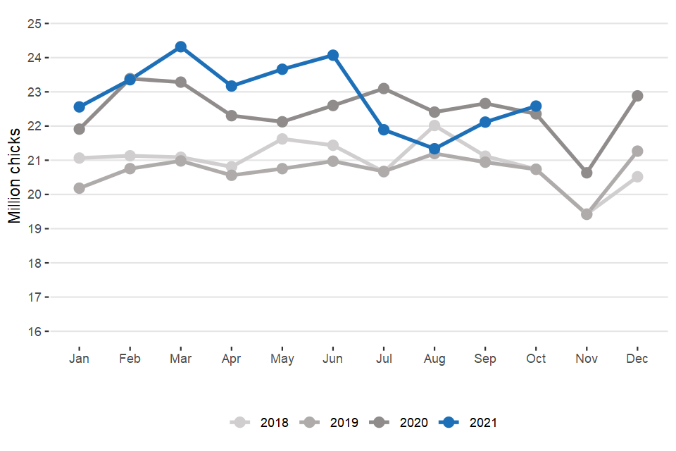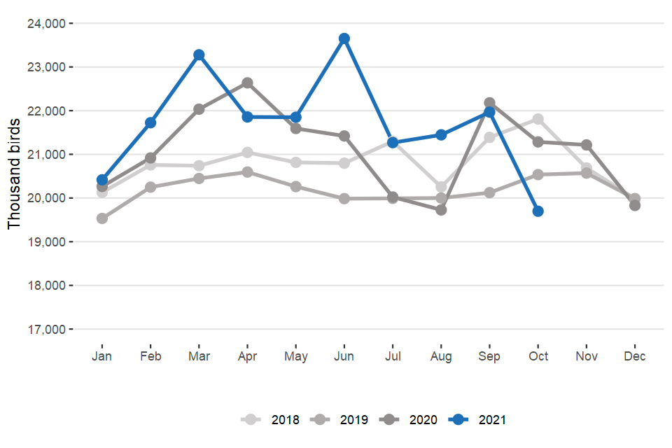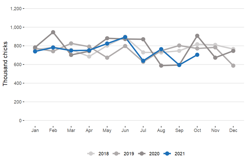 Northern Ireland slaughter data from September 2021 is estimated. Northern Ireland hatcheries data for October 2021 is estimated. Scotland slaughter and hatcheries data for October 2021 is estimated.