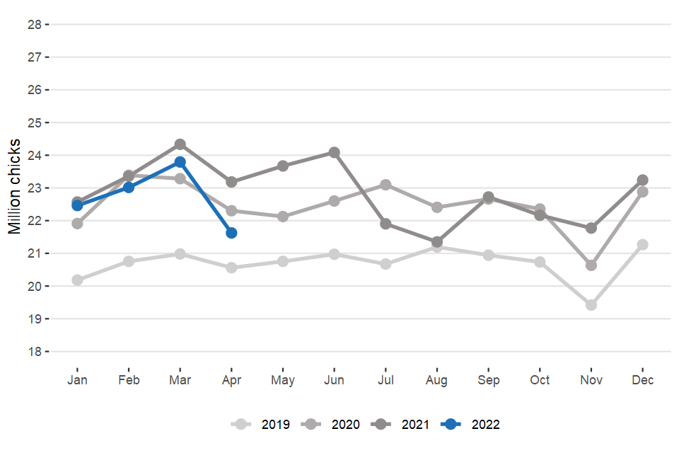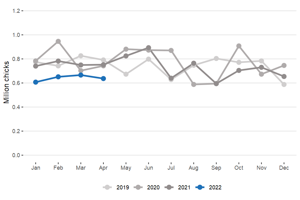 Northern Ireland slaughter data from December 2021 is estimated. Scotland slaughter and hatcheries data for April 2022 is estimated.
