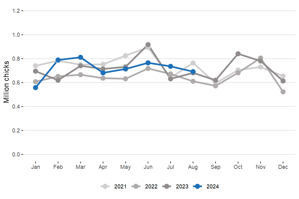 Northern Ireland slaughter data from December 2023 is estimated. Northern Ireland hatcheries data from November 2023 is estimated. Scotland slaughter and hatcheries data for May 2024 is estimated.