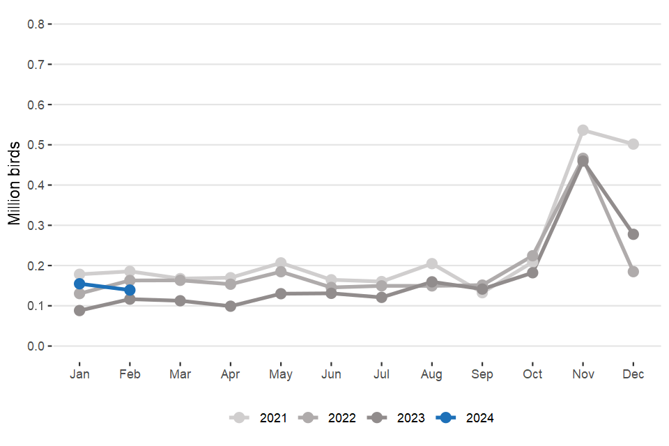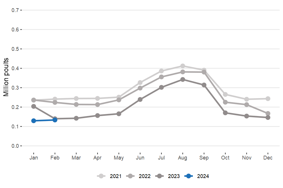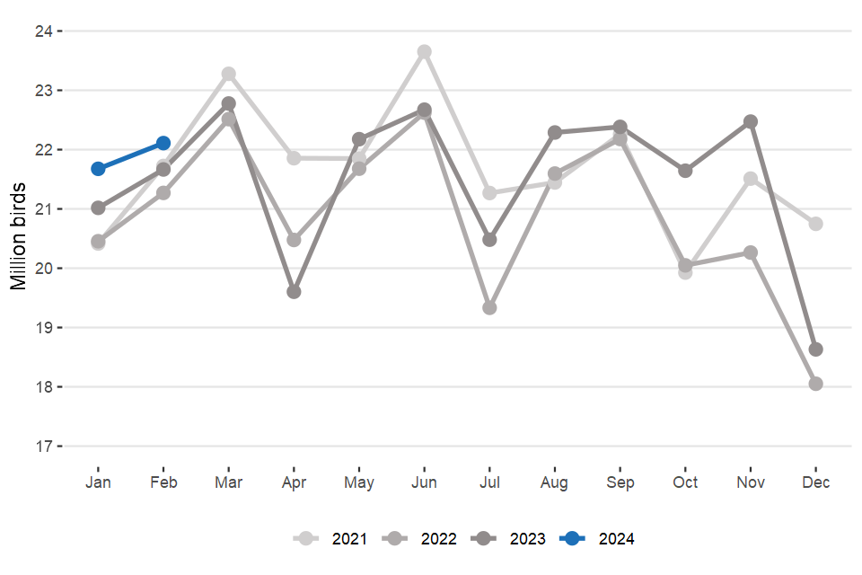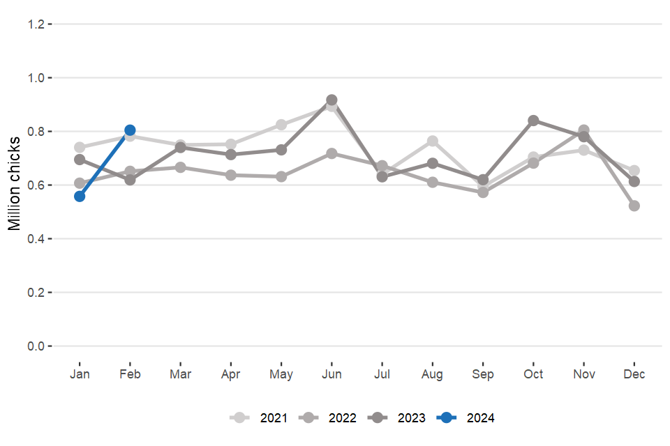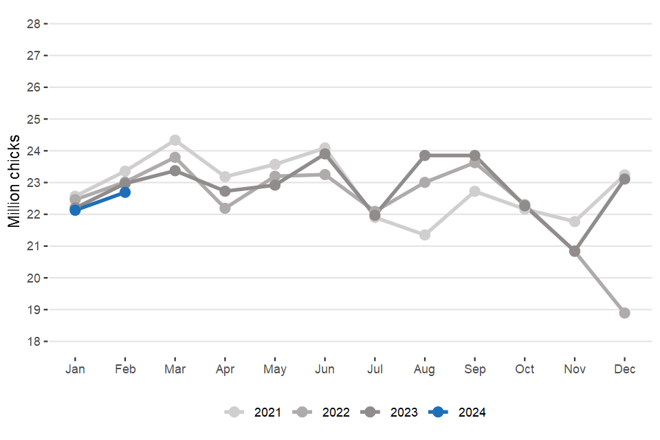 Northern Ireland slaughter data from September 2023 is estimated. Northern Ireland hatcheries data for November, December, January and February is estimated.