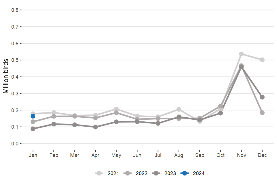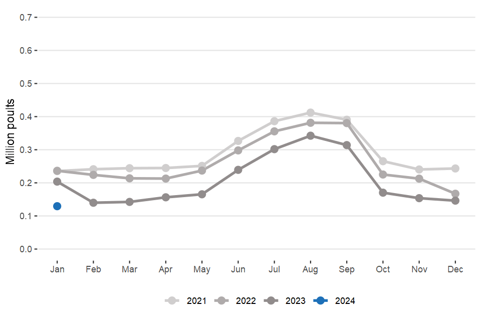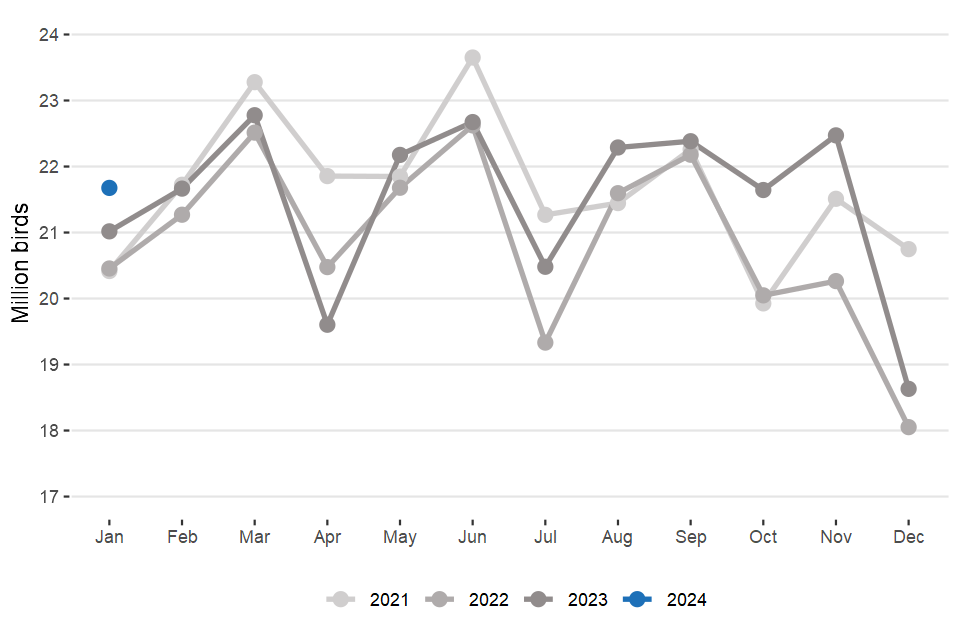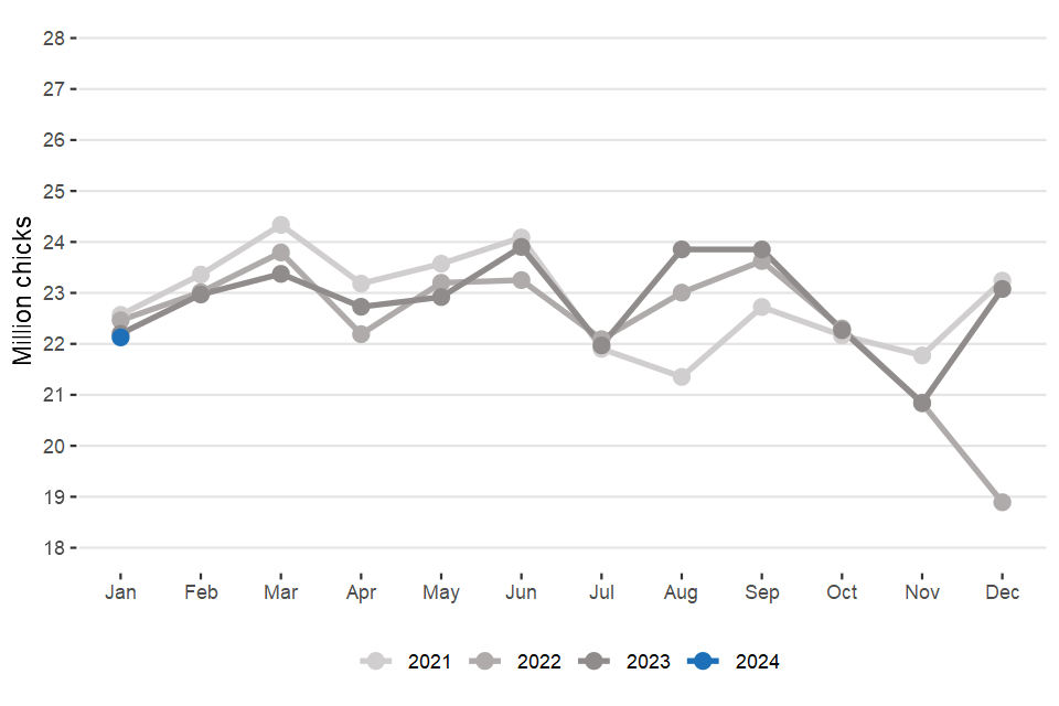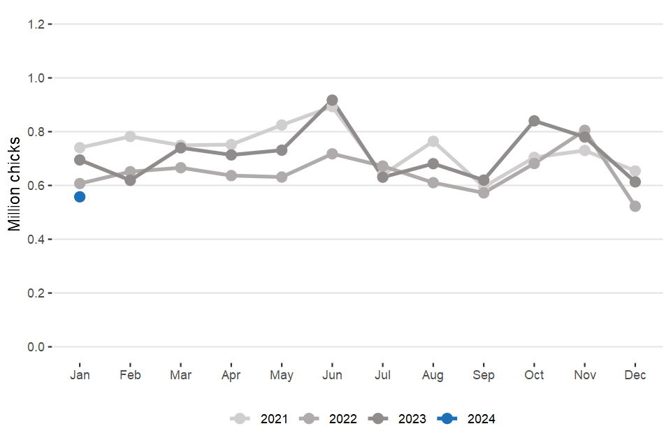 Northern Ireland slaughter data from September 2023 is estimated. Northern Ireland hatcheries data for November, December and January is estimated.
