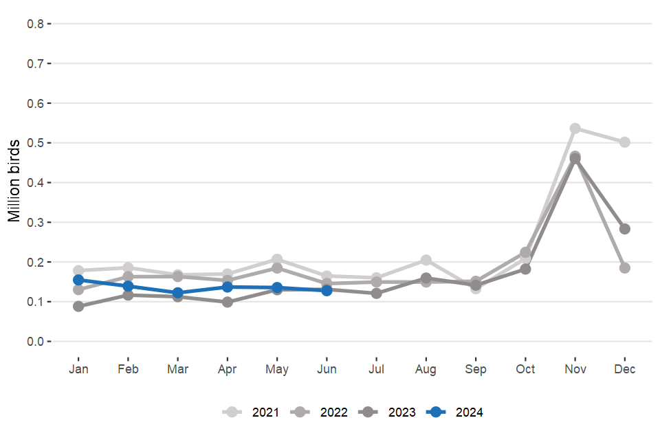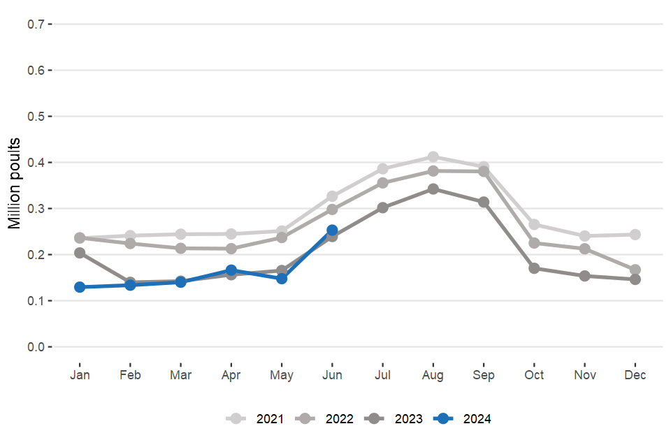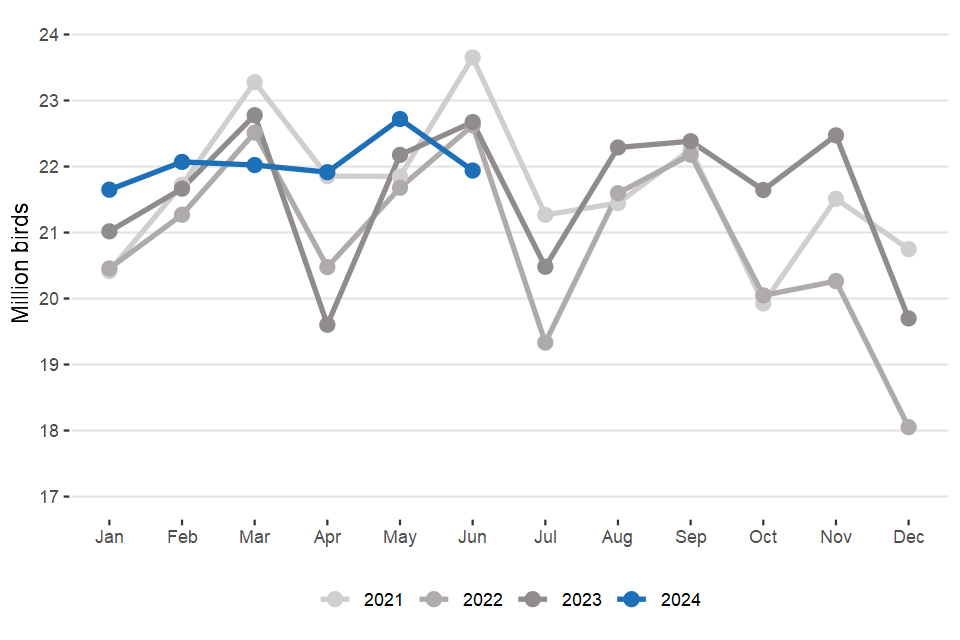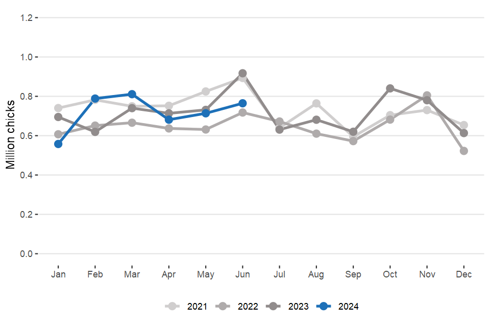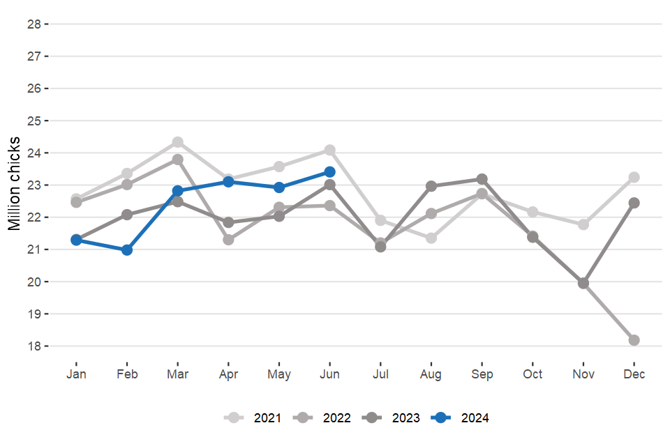 Northern Ireland slaughter data from December 2023 is estimated. Northern Ireland hatcheries data from November 2023 is estimated. Scotland slaughter and hatcheries data for May 2024 is estimated.