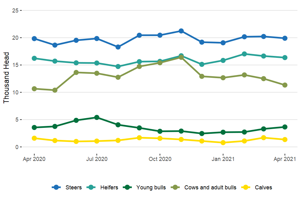 Monthly UK statistics on cattle, sheep and pig slaughter and meat production: April 2021 (first published 13 May 2021)