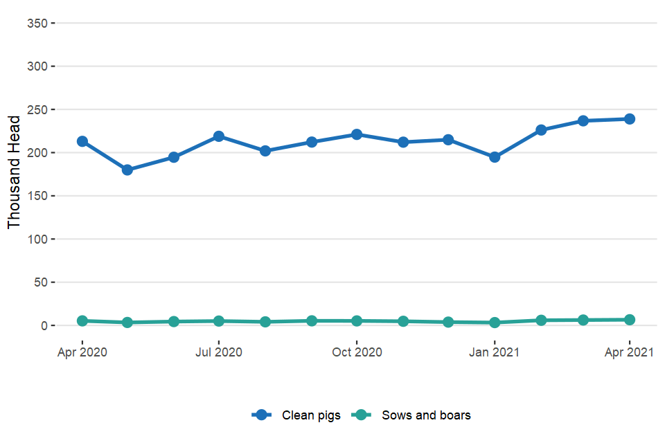 UK clean pig slaughterings were 5.0% higher than in April 2020 at 959,000 head. Pigmeat production was 87,000 tonnes, 6.6% higher than in April 2020.