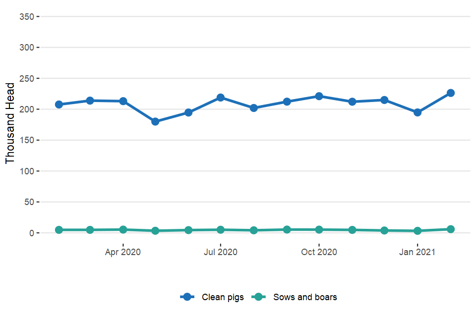 UK clean pig slaughterings were 5.2% higher than in February 2020 at 905,000 head. Pigmeat production was 85,000 tonnes, 9.5% higher than in February 2020.