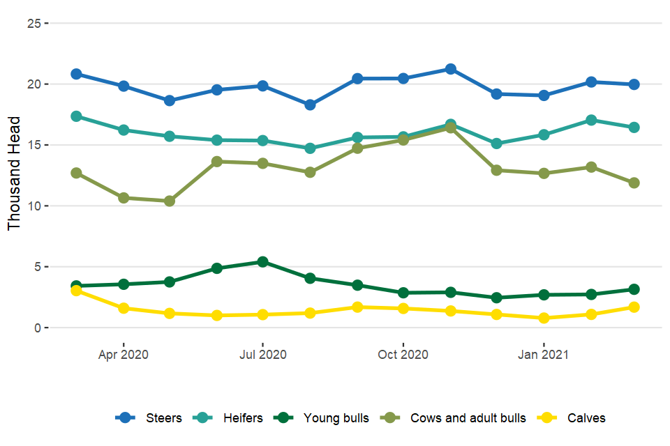 Monthly UK statistics on cattle, sheep and pig slaughter and meat production: March (first published 15 April 2021)