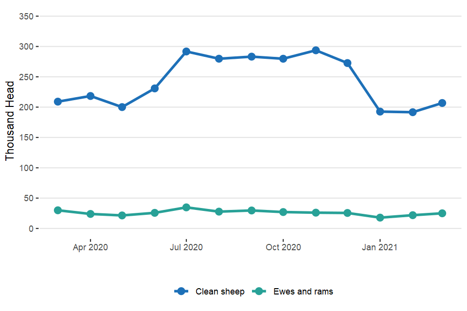 UK clean sheep slaughterings were down 1.1% on March 2020 at 916,000 head. Mutton and lamb production was 22,000 tonnes, 0.3% lower than in March 2020.