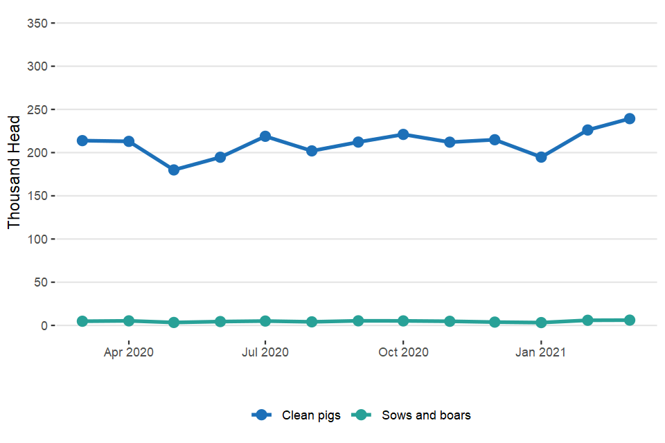 UK clean pig slaughterings were 12% higher than in March 2020 at 1060,000 head. Pigmeat production was 98,000 tonnes, 15% higher than in March 2020.