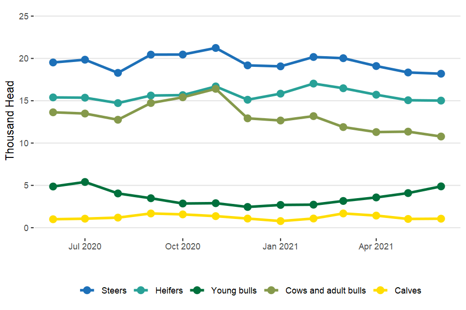 UK prime cattle (steers, heifers and young bulls) slaughterings in June 2021 were down 4.2% on June 2020 at 163,000 head. Beef and veal production was 72,000 tonnes, 7.9% lower than in June 2020.