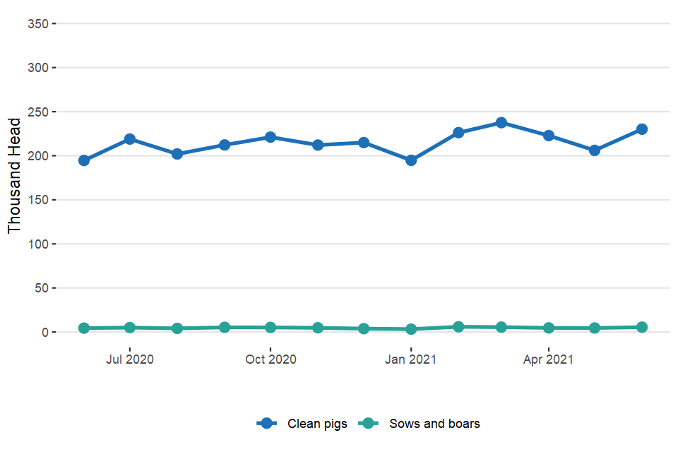 UK clean pig slaughterings were 18% higher than in June 2020 at 986,000 head. Pigmeat production was 89,000 tonnes, 20% higher than in June 2020.