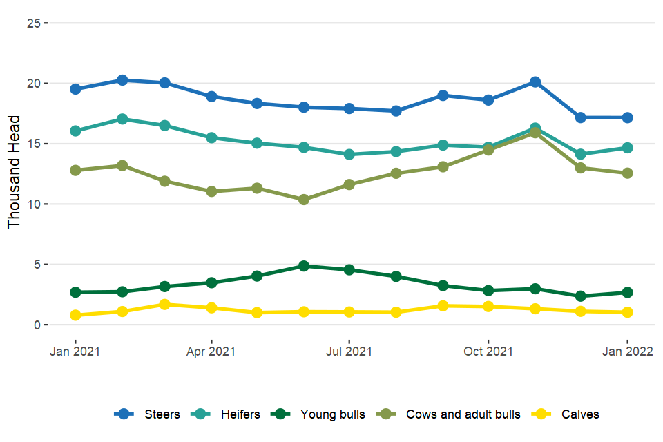 UK prime cattle (steers, heifers and young bulls) slaughterings in January 2022 were down 9.9% on January 2021 at 153,000 head. Beef and veal production was 71,000 tonnes, 7.9% lower than in January 2021.