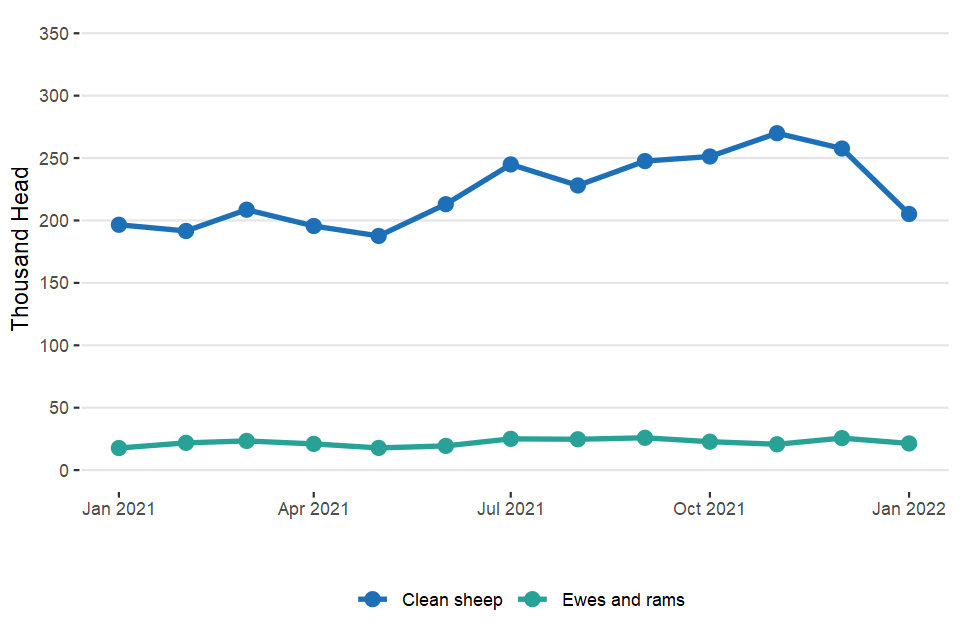 UK clean sheep slaughterings were up 4.4% on January 2021 at 909,000 head. Mutton and lamb production was 21,000 tonnes, 8.5% higher than in January 2021.