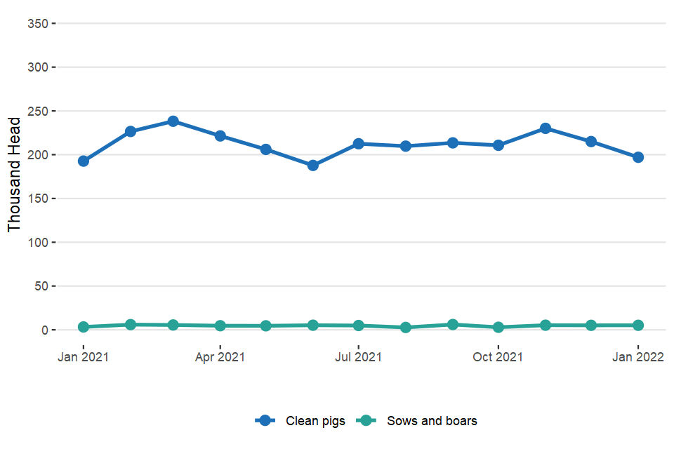 UK clean pig slaughterings were up 2.3% on January 2021 at 873,000 head. Pigmeat production was 86,000 tonnes, 8.1% higher than in January 2021.