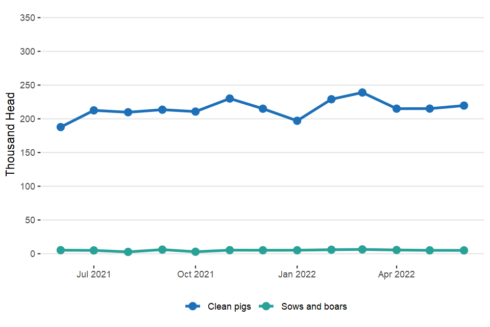 UK clean pig slaughterings were up 17% on June 2021 at 941,000 head. Pigmeat production was 87,000 tonnes, 19% higher than in June 2021.