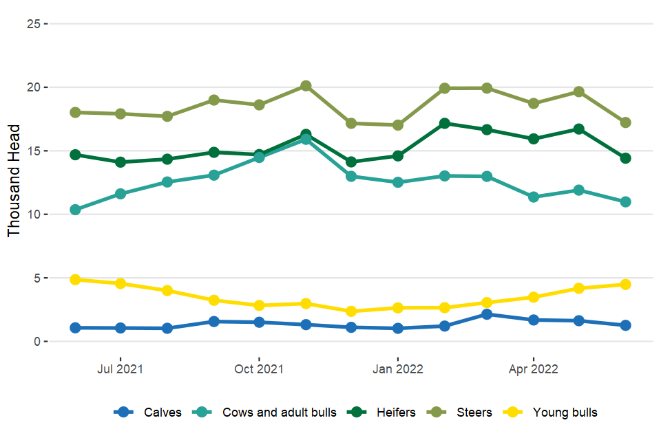 UK prime cattle (steers, heifers and young bulls) slaughterings in June 2022 were down 3.8% on June 2021 at 155,000 head. Beef and veal production was 69,000 tonnes, 2.0% lower than in June 2021.