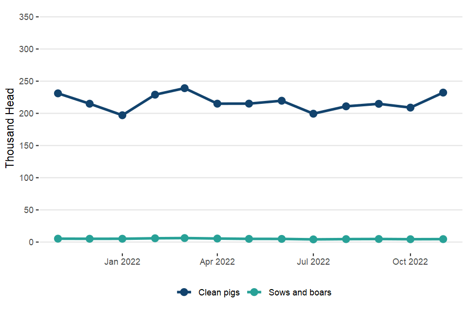 UK clean pig slaughterings were up 0.5% on November 2021 at 995,000 head. Pigmeat production was 92,000 tonnes, 1.5% lower than in November 2021.