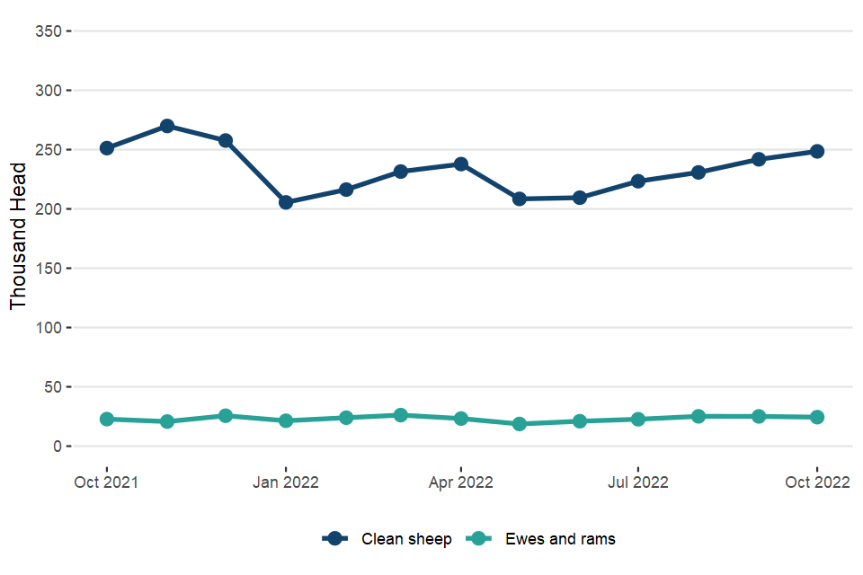UK clean sheep slaughterings were down 1.1% on October 2021 at 1101,000 head. Mutton and lamb production was 24,000 tonnes, 1.4% lower than in October 2021.