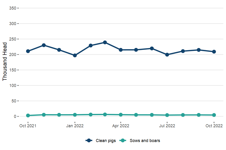 UK clean pig slaughterings were down 0.8% on October 2021 at 926,000 head. Pigmeat production was 86,000 tonnes, 1.1% lower than in October 2021.