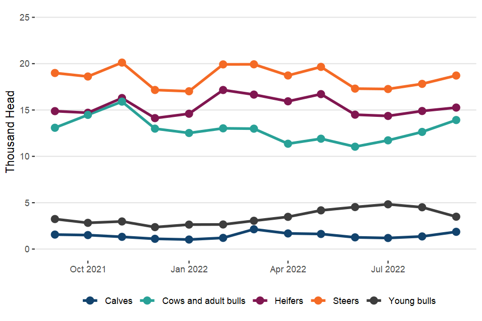 UK prime cattle (steers, heifers and young bulls) slaughterings in September 2022 were up 1.0% on September 2021 at 161,000 head. Beef and veal production was 73,000 tonnes, 0.7% higher than in September 2021.