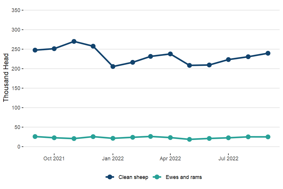 UK clean sheep slaughterings were down 3.2% on September 2021 at 1027,000 head. Mutton and lamb production was 23,000 tonnes, 4.8% lower than in September 2021.