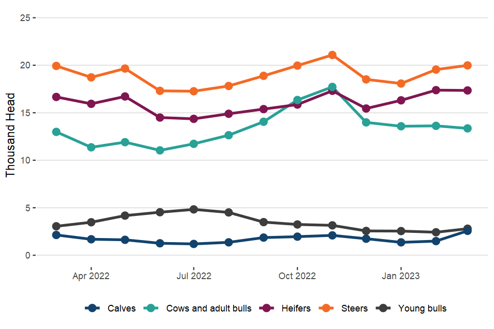 Monthly UK statistics on cattle, sheep and pig slaughter and meat production – March 2023 (published 13 April 2023)